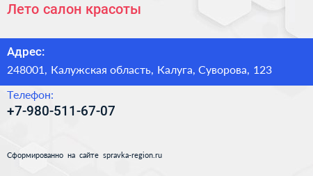 Лето, салон красоты по адресу 248001, Калужская область, Калуга, Суворова, 123 в дальнейшем Организация, размещена в следующих категориях: