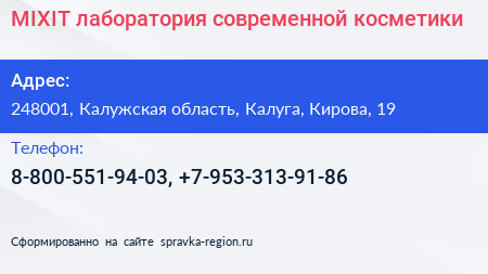 MIXIT, лаборатория современной косметики по адресу 248001, Калужская область, Калуга, Кирова, 19 в дальнейшем Организация, размещена в следующих категориях: