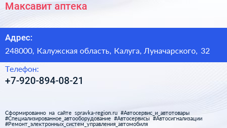 Максавит, аптека по адресу 248000, Калужская область, Калуга, Луначарского, 32 в дальнейшем Организация, размещена в следующих категориях: