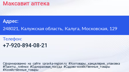 Максавит, аптека по адресу 248021, Калужская область, Калуга, Московская, 129 в дальнейшем Организация, размещена в следующих категориях: