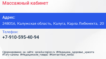 Массажный кабинет по адресу 248016, Калужская область, Калуга, Карла Либкнехта, 20 в дальнейшем Организация, размещена в следующих категориях: