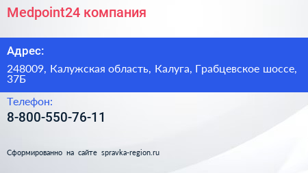 Medpoint24, компания по адресу 248009, Калужская область, Калуга, Грабцевское шоссе, 37Б в дальнейшем Организация, размещена в следующих категориях: