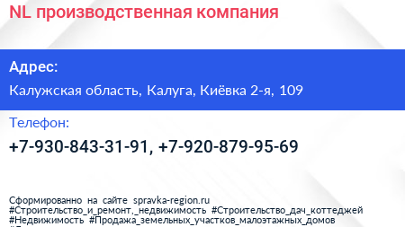NL, производственная компания по адресу Калужская область, Калуга, Киёвка 2-я, 109 в дальнейшем Организация, размещена в следующих категориях: