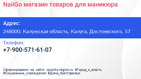 NailGo, магазин товаров для маникюра по адресу 248000, Калужская область, Калуга, Достоевского, 57 в дальнейшем Организация, размещена в следующих категориях: