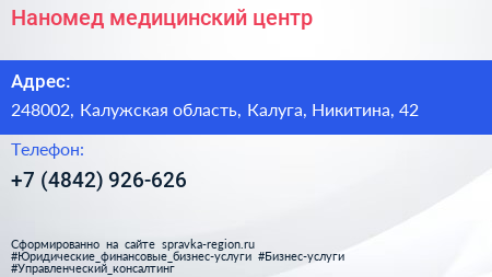 Наномед, медицинский центр по адресу 248002, Калужская область, Калуга, Никитина, 42 в дальнейшем Организация, размещена в следующих категориях: