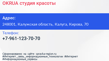 OKRUA, студия красоты по адресу 248001, Калужская область, Калуга, Кирова, 70 в дальнейшем Организация, размещена в следующих категориях: