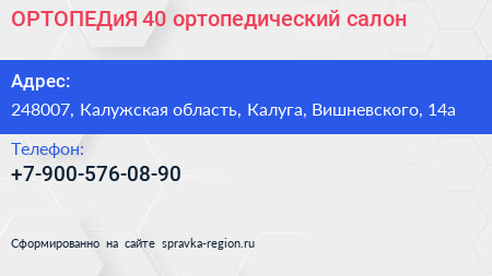 ОРТОПЕДиЯ 40, ортопедический салон по адресу 248007, Калужская область, Калуга, Вишневского, 14а в дальнейшем Организация, размещена в следующих категориях: