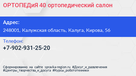 ОРТОПЕДиЯ 40, ортопедический салон по адресу 248001, Калужская область, Калуга, Кирова, 56 в дальнейшем Организация, размещена в следующих категориях: