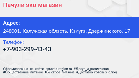 Пачули, эко-магазин по адресу 248001, Калужская область, Калуга, Дзержинского, 17 в дальнейшем Организация, размещена в следующих категориях: