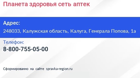 Планета здоровья, сеть аптек по адресу 248033, Калужская область, Калуга, Генерала Попова, 1а в дальнейшем Организация, размещена в следующих категориях: