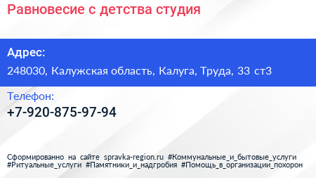 Равновесие с детства, студия по адресу 248030, Калужская область, Калуга, Труда, 33 ст3 в дальнейшем Организация, размещена в следующих категориях: