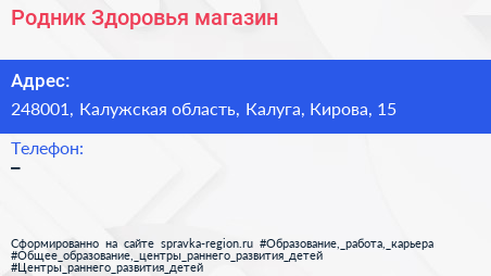 Родник Здоровья, магазин по адресу 248001, Калужская область, Калуга, Кирова, 15 в дальнейшем Организация, размещена в следующих категориях:
