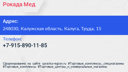Рокада Мед по адресу 248030, Калужская область, Калуга, Труда, 15 в дальнейшем Организация, размещена в следующих категориях: