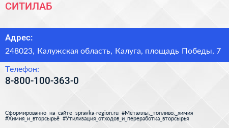 СИТИЛАБ по адресу 248023, Калужская область, Калуга, площадь Победы, 7 в дальнейшем Организация, размещена в следующих категориях: