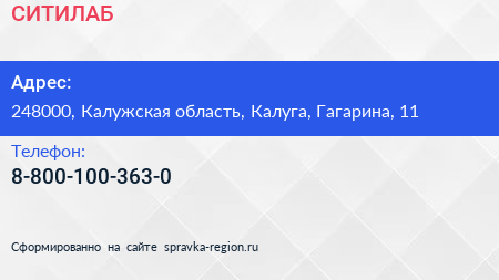 СИТИЛАБ по адресу 248000, Калужская область, Калуга, Гагарина, 11 в дальнейшем Организация, размещена в следующих категориях: