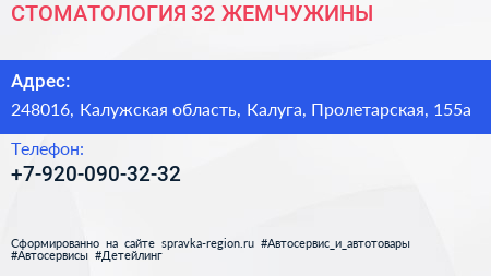 СТОМАТОЛОГИЯ 32 ЖЕМЧУЖИНЫ по адресу 248016, Калужская область, Калуга, Пролетарская, 155а в дальнейшем Организация, размещена в следующих категориях: