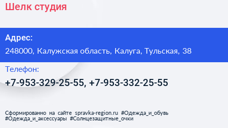 Шелк, студия по адресу 248000, Калужская область, Калуга, Тульская, 38 в дальнейшем Организация, размещена в следующих категориях: