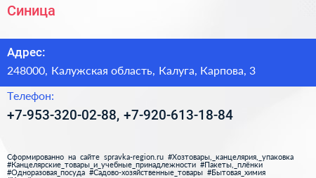 Синица по адресу 248000, Калужская область, Калуга, Карпова, 3 в дальнейшем Организация, размещена в следующих категориях:
