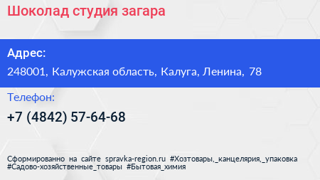 Шоколад, студия загара по адресу 248001, Калужская область, Калуга, Ленина, 78 в дальнейшем Организация, размещена в следующих категориях: