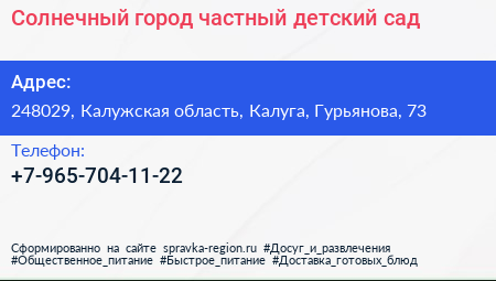 Солнечный город, частный детский сад по адресу 248029, Калужская область, Калуга, Гурьянова, 73 в дальнейшем Организация, размещена в следующих категориях: