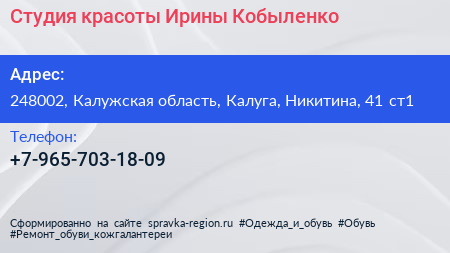 Студия красоты Ирины Кобыленко по адресу 248002, Калужская область, Калуга, Никитина, 41 ст1 в дальнейшем Организация, размещена в следующих категориях: