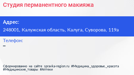 Студия перманентного макияжа по адресу 248001, Калужская область, Калуга, Суворова, 119а в дальнейшем Организация, размещена в следующих категориях: