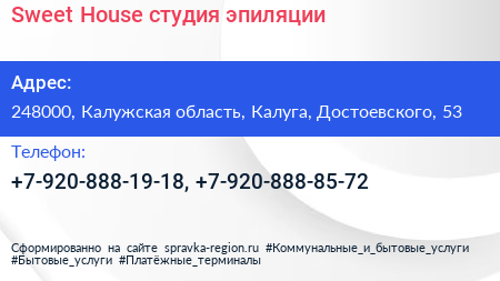 Sweet House, студия эпиляции по адресу 248000, Калужская область, Калуга, Достоевского, 53 в дальнейшем Организация, размещена в следующих категориях: