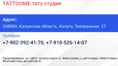TATTOOME, тату-студия по адресу 248000, Калужская область, Калуга, Театральная, 17 в дальнейшем Организация, размещена в следующих категориях: