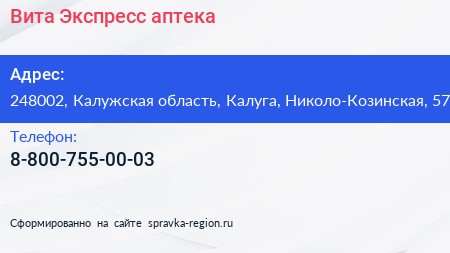 Вита Экспресс, аптека по адресу 248002, Калужская область, Калуга, Николо-Козинская, 57 в дальнейшем Организация, размещена в следующих категориях: