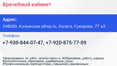 Врачебный кабинет по адресу 248030, Калужская область, Калуга, Суворова, 77 к3 в дальнейшем Организация, размещена в следующих категориях: