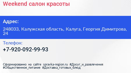 Weekend, салон красоты по адресу 248033, Калужская область, Калуга, Георгия Димитрова, 24 в дальнейшем Организация, размещена в следующих категориях: