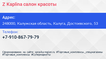 Z.Kaplina, салон красоты по адресу 248000, Калужская область, Калуга, Достоевского, 53 в дальнейшем Организация, размещена в следующих категориях:
