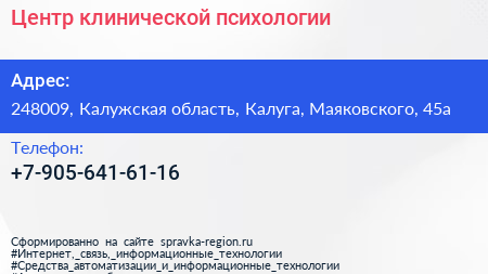 Центр клинической психологии по адресу 248009, Калужская область, Калуга, Маяковского, 45а в дальнейшем Организация, размещена в следующих категориях: