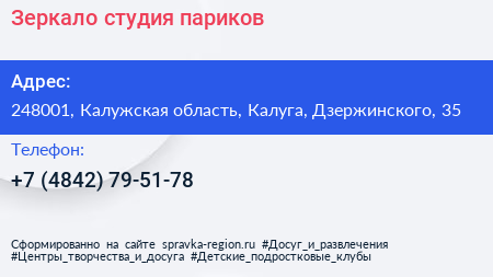 Зеркало, студия париков по адресу 248001, Калужская область, Калуга, Дзержинского, 35 в дальнейшем Организация, размещена в следующих категориях: