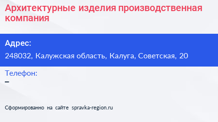 Архитектурные изделия, производственная компания по адресу 248032, Калужская область, Калуга, Советская, 20 в дальнейшем Организация, размещена в следующих категориях: