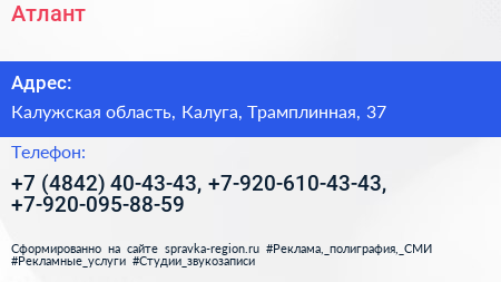 Атлант по адресу Калужская область, Калуга, Трамплинная, 37 в дальнейшем Организация, размещена в следующих категориях: