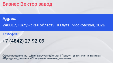 Бизнес-Вектор, завод по адресу 248017, Калужская область, Калуга, Московская, 302Б в дальнейшем Организация, размещена в следующих категориях: