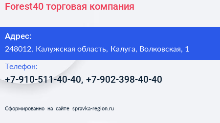 Forest40, торговая компания по адресу 248012, Калужская область, Калуга, Волковская, 1 в дальнейшем Организация, размещена в следующих категориях: