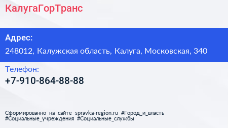 КалугаГорТранс по адресу 248012, Калужская область, Калуга, Московская, 340 в дальнейшем Организация, размещена в следующих категориях: