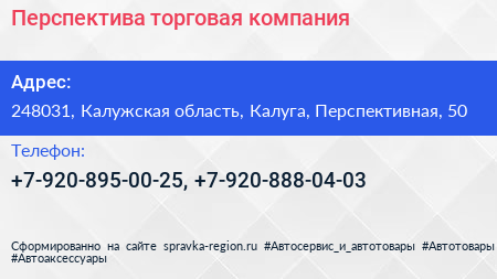 Перспектива, торговая компания по адресу 248031, Калужская область, Калуга, Перспективная, 50 в дальнейшем Организация, размещена в следующих категориях: