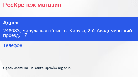 РосКрепеж, магазин по адресу 248033, Калужская область, Калуга, 2-й Академический проезд, 17 в дальнейшем Организация, размещена в следующих категориях: