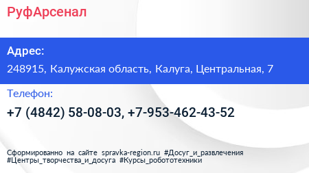РуфАрсенал по адресу 248915, Калужская область, Калуга, Центральная, 7 в дальнейшем Организация, размещена в следующих категориях: