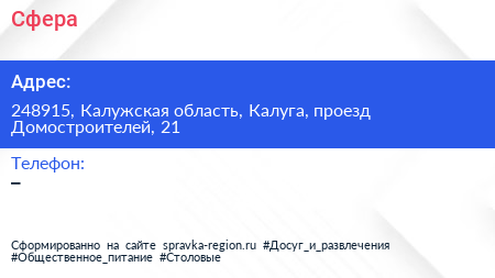 Сфера по адресу 248915, Калужская область, Калуга, проезд Домостроителей, 21 в дальнейшем Организация, размещена в следующих категориях: