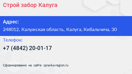 Строй забор Калуга по адресу 248012, Калужская область, Калуга, Кибальчича, 30 в дальнейшем Организация, размещена в следующих категориях: