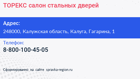 ТОРЕКС, салон стальных дверей по адресу 248000, Калужская область, Калуга, Гагарина, 1 в дальнейшем Организация, размещена в следующих категориях: