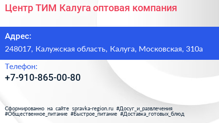 Центр-ТИМ Калуга, оптовая компания по адресу 248017, Калужская область, Калуга, Московская, 310а в дальнейшем Организация, размещена в следующих категориях: