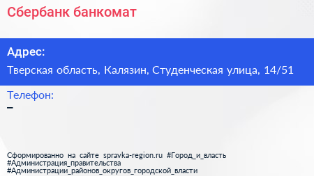 Сбербанк, банкомат по адресу Тверская область, Калязин, Студенческая улица, 14/51 в дальнейшем Организация, размещена в следующих категориях: