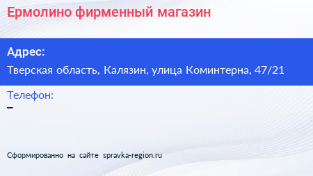 Ермолино, фирменный магазин по адресу Тверская область, Калязин, улица Коминтерна, 47/21 в дальнейшем Организация, размещена в следующих категориях: