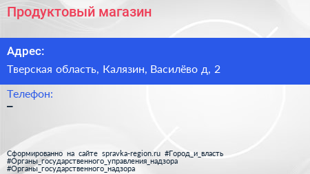 Продуктовый магазин по адресу Тверская область, Калязин, Василёво д, 2 в дальнейшем Организация, размещена в следующих категориях: