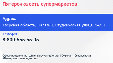 Пятерочка, сеть супермаркетов по адресу Тверская область, Калязин, Студенческая улица, 14/51 в дальнейшем Организация, размещена в следующих категориях: